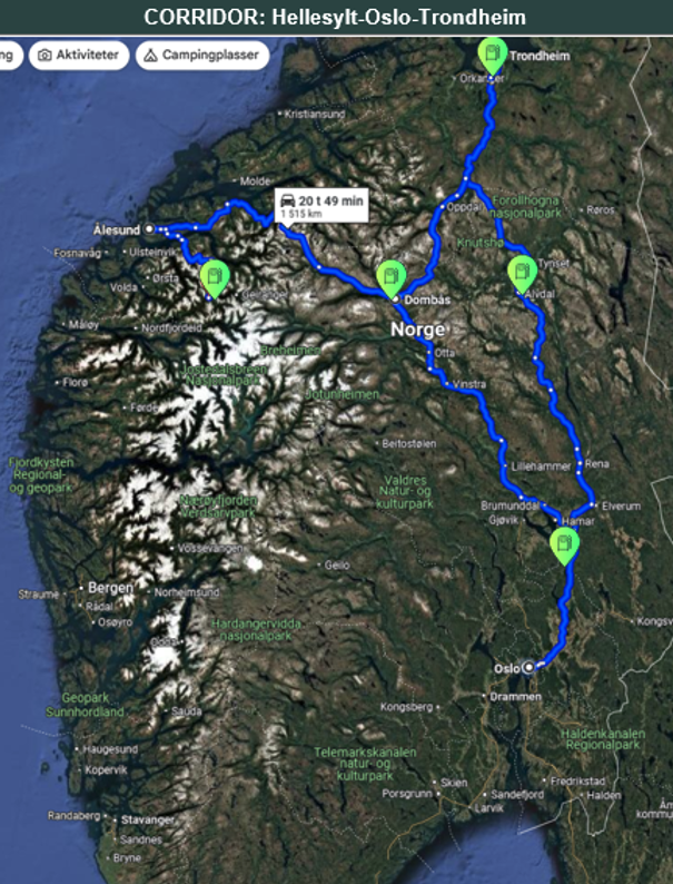 Stasjonene skal etableres i Trondheim, Innlandsporten, Dombås og Alvdal. Alle stasjonene skal bygges for å betjene primært tunge kjøretøyer og vil tilby grønt hydrogen ved både 350 og 700 bar. For å sikre redundans vil korridoren tilby muligheten til to ulike ruter mellom Oslo og Trondheim, via Gudbrandsdalen og Østerdalen. Tilskuddet gir også støtte til Vireon til å kjøpe en flåte av transportcontainere for å distribuere hydrogen fra produksjonssted til stasjonene.