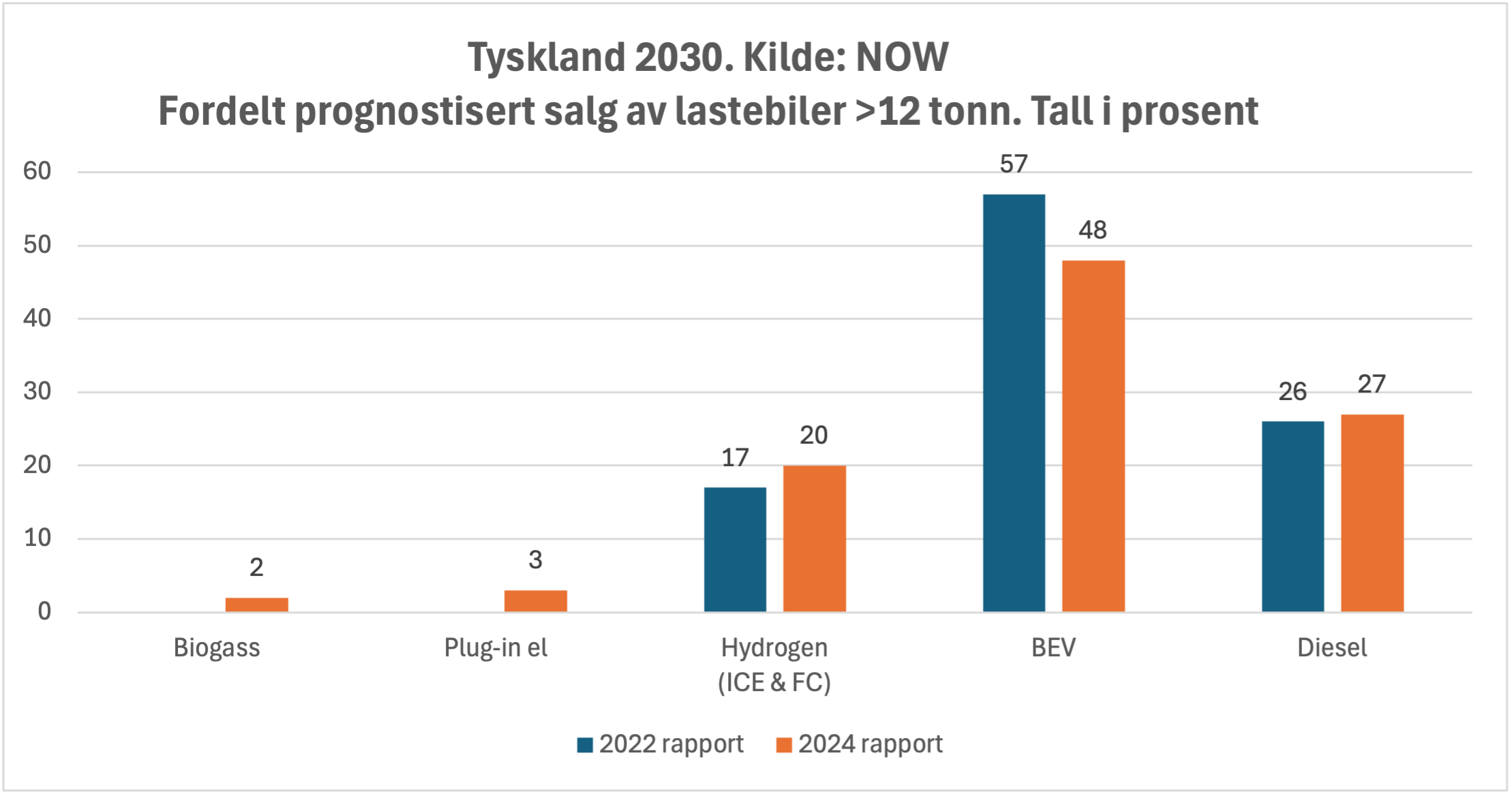 I en ny rapport utarbeidet av tyske NOW (altså Tysklands svar på Enova) blir det anslått at hydrogenlastebiler vil nå en markedsandel på 20% frem mot 2030. Det tilsvarende tallet for biogasskjøretøy er derimot på kun 2%. Dette er ikke overraskende. Det er likevel et tankekors i forhold til utviklingen her i Norge.