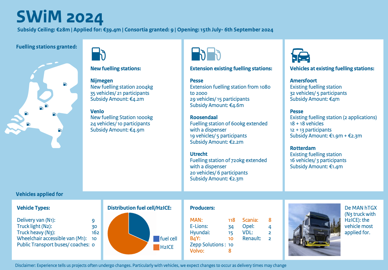 Det nederlandske støtteprogrammet har fått navnet SWiM – Subsidieregeling Waterstof in mobiliteit. Det skal gjøres årlige utlysninger. Den første ble gjennomført i perioden juli-september 2024. Nå er altså resultatene klare, og dette ser ut til å være en omfattende satsing. Det er verdt å merke seg at man her må søke som konsortier, der det inngår både stasjon og kjøretøy. På den måten vil myndigheten sikre at det er tilstrekkelig etterspørsel til at stasjonene oppnår lønnsomhet, og man vil unngå å investere offentlige penger i infrastruktur som ikke benyttes. Dette er noe mange europeiske land nå er opptatt av når de skal oppfylle ADIRs krav til etablering av hydrogenstasjoner.